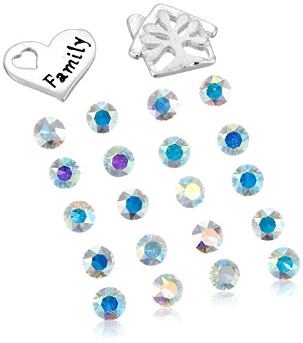 Stainless steel round pendant necklace featuring transparent locket center with loose crystals and engraved "Family" heart and tree-house charms