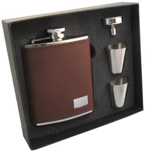 Studio : Visol Products Publisher : Visol Products Binding : Kitchen Product Description Rugged and tough, this masculine gift set is an ideal choice for your groomsmen's gift. This gift set features a stainless steel flask, funnel and two shot cups to be used when you want to enjoy a drink. The six ounce flask is wrapped in smooth, dark brown leather that will look great whether it goes with you to a sports game or a hunting trip. It features a captive top you won't ever have to worry about losing since it is permanently attached to this flask. Add a name or initials to the engraving plaque on the bottom corner of the flask to give this gift set a personal touch that will be admired. 0