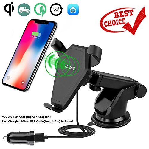-. Feature : 【2-in-1 Function】: Support Sucker Stent installation and Air Vent mounting as your prefer. Sucker Stent installation way supports 360°rotating,it provides you a better viewing angle; Air Vent mounting way helps cool down your phone while charging. / 【Self-Adaption Charging】: Support two charging modes,Fast Charging(10W) and Standard Charging(5W). With particular function of Self-Adaption,when charge for fast-charging phones(Samsung Note 8, S8/S8+, S7/S7 Edge, S6 Edge+, Note 5 etc.),it's Fast Charging mode(10W.Require fast-charging adapter & fast-charging Micro USB cable); when charge for standard-charging phones(iPhone X,iPhone 8/8Plus etc.) it's Standard Charging mode(5W). It provides better protection for your phone. / 【Free Car Adapter & Cable】: QC3.0 fast-charging Car Adapter & fast-charging Micro USB cable(length:1meter) included for free. They bring you Perfect completely fast charging experience when you charge for fast-charging phones(Samsung Note 8, S8/S8+,S7/S7 Edge, S6 Edge+,Note 5 etc.). / 【Widely Compatibility】: Compatible with all Qi-Enabled phones,you can get it charging freely and easily as long as your phone support Qi wireless charging. Moreover,for phones which without wireless charging function,just with an additional wireless charging receiver(Not Included),it's also well compatible. / 【Safer Charging】: With High Quality built-in intelligent chip,it provides particular multiple protection of Over-voltage,Over-current,Over-charge and Short-Circuit,which ensures a much safer charging environment for you.