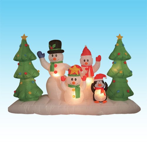 -. Title : 8 Foot Long Inflatable Snowmen Family w/ Pet Penguin Around Christmas Trees