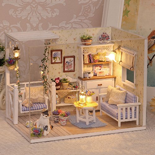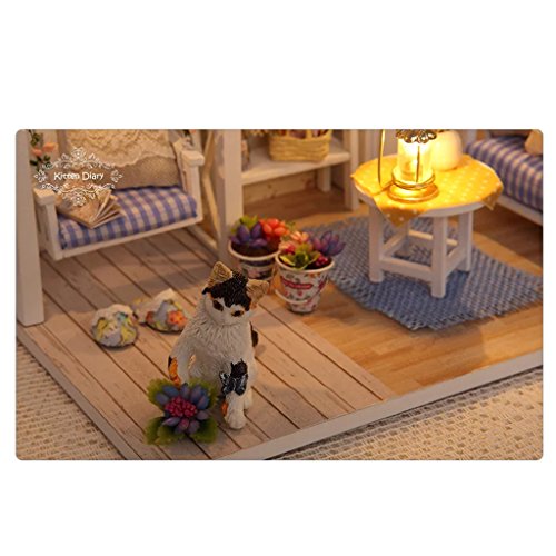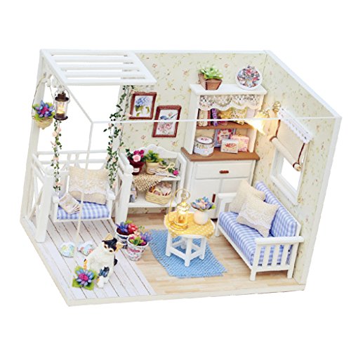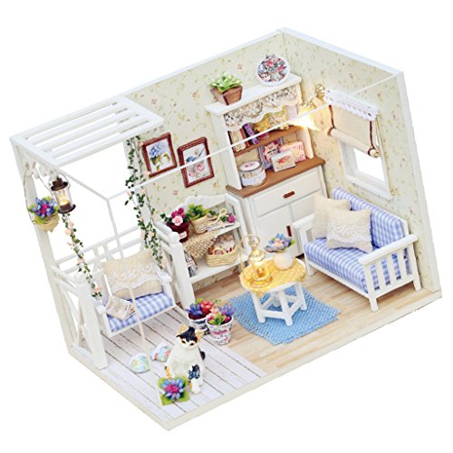 DIY miniature dollhouse cancultivate children's creativity and imagination; train the patience,circumspection and a sense of achievement - All the materials are thesame as real house! Great for your table, showcase, or Windom decor, ornament- making your home more beautiful. It's very romantic to send it to friends as gift Material: Wooden, Cloth, LED Light, Paper, etc. Color: As pictures shown. Warning: Chocking Hazard-Small parts, not for children under 12 years old. Specification: It is not finished model, you have to make it all by yourself 2Pieces AAA (1.5V) Batteries are needed (Notice: Batteries should beinstalled by adults correctly for safety, and then close the batterycase) Size Chart: Assembled Size (L x W x H): Approx 17.1 x 11.6 x 13.1cm/6.73 x 4.57 x 5.16inch Package Box Size (L x W x H): Approx 6 x 24.5 x 18cm/2.36 x 9.65 x 7.09inch