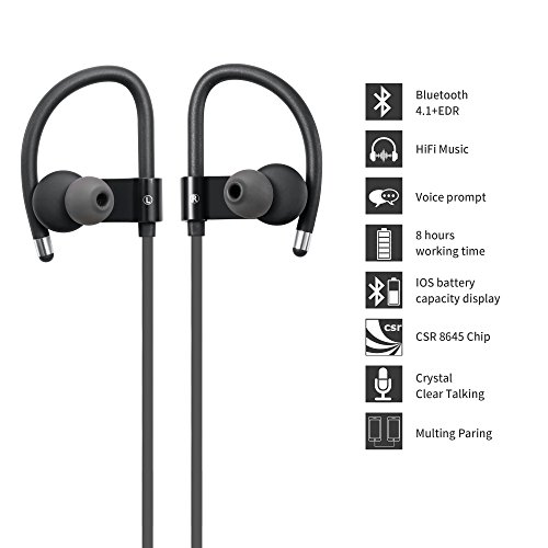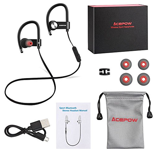 -. Feature : SUPERIOR HIFI SOUND -- ACEPOW Wireless Bluetooth Headphones with mic are equipped with advanced APT-X two-channel stereo, offering you perfect HIFI sound quality with deep bass. DSP + CVC 6.0 noise cancellation technology allows you to focus on your favorite music and chat without external noise. / SWEAT PROOF COMFORTABLE FIT -- ACEPOW Sports sweat proof Bluetooth Earbuds are rated IPX 7 withstanding dripping sweat. The ergonomic ear hooks contain S/M/L customized comfortable silicone eartips to ensure a comfortable fit for everyone. Neckband design prevents troublesome wires from tangling during your workout or sports time. / LONG WORKING TIME--Up to 8 hours talk/play time with 240h ultra-long standby time (full charge in just 1-2 hours). Voice Prompt function enables you to know using status; easily accessible on-ear control; automatically reporting in-coming phone number; connect two Bluetooth devices simultaneously and transfer calls between two mobile phones; support iOS battery monitoring. / BLUETOOTH V4.1 WIRELESS TECHNOLOGY -- The wireless earphones connect seamlessly with universal devices up to 33ft away -iPhone 7, 8, iPhone 6, 6 Plus, 6S Plus, 6S, iPhone5 5s 5c, iPad Air; Samsung Galaxy S6 S7 Note 7 8; HTC M9 M8 M7; LG Flex 2 G3 G2; Apple watch and any other Bluetooth-enabled cell phones and devices. / TWO YEARS WARRANTY -- We are sure you would fall in love with ACEPOW wireless bluetooth headsets, thus we provide you with 2-year manufacturer's warranty and 30 days no-question ask replacememnt or money back guarantee. If you have any complaints, please let us know and we will solve your problem within 24 hours.