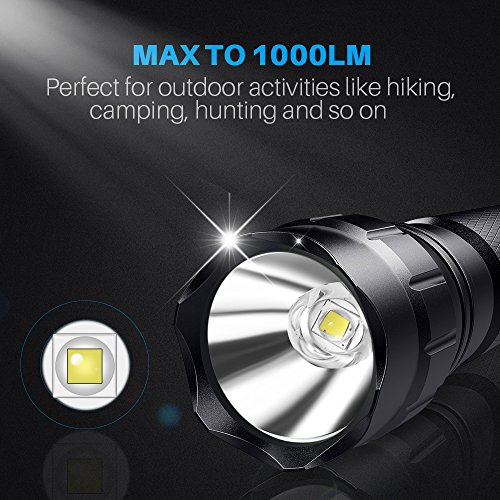 - SUPER BRIGHT LIGHT: High-Efficiency and Great Output,Max output 1000 Lumens when battery full charged; Perfect flashlight for outdoor activities like hiking, camping, hunting, and so on.