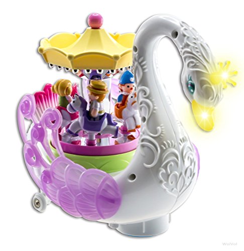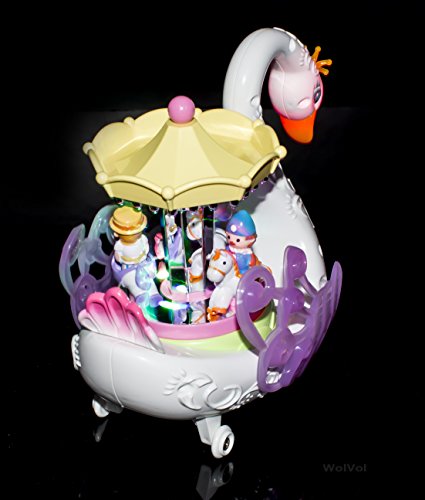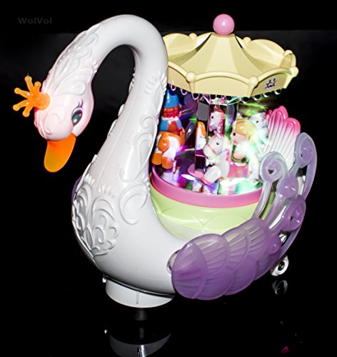 Surprise your little ones with this WolVol stunning entertaining Carousel Music Box. The horses will rotate and go up & down while the music sings along and at the same time the Swan will ride around the house going on its own. The child will be mesmerized by all the lights, music, and moving parts. Let the children imagine as if they are at the amusement park. Great gift idea for children ages 3 years and up.Feature