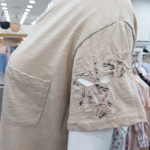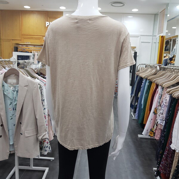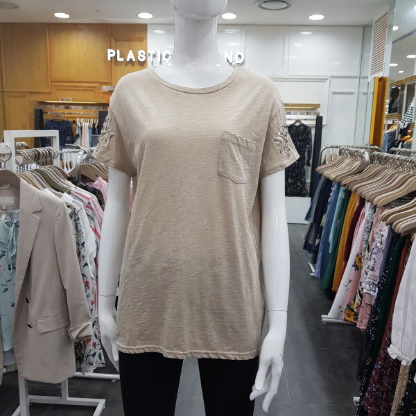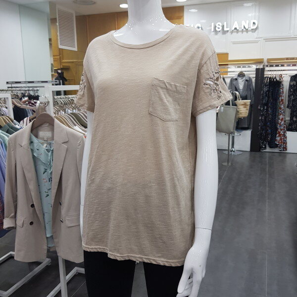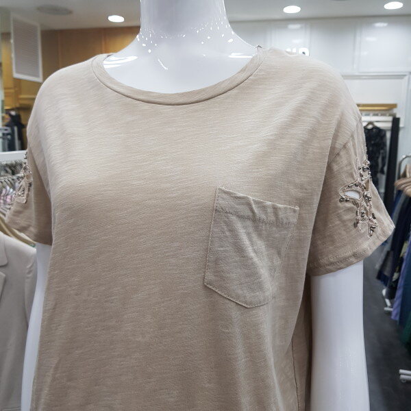 소매 비즈 포인트 티셔츠예요~깔끔하면서 소매 포인트가 여성스러움을 더해줍니다~