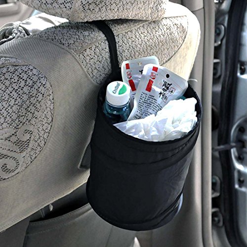 Perfect for keeping trash in the car or during a Picnic! This collapsible trash can is perfect for the car and makes for easy clean up. 2 Different Ways to put in your car: You can use the elastic strap or there is Velcro on the bottom so you can attach it somewhere. Pop-up Open Design: Easy to store when not using Size: 6" Diameter by 8" High Perfect for Empty Bottles, Sweet Wrappers, Tea & Coffee Cups, Sandwich Packaging Can use in Car, Office, Camping, Desktop, Bedside, etc Package include: 2 x Car BinFeature