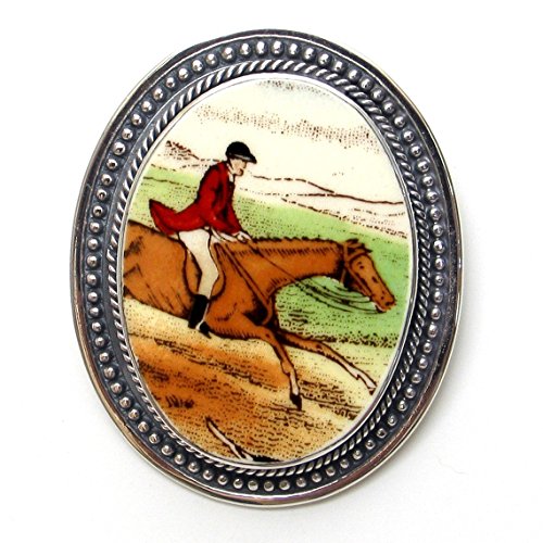 -. Title : Broken China Jewelry Copeland Spode The Hunt Rider on Horse Gone Away Sterling Pin Pendant
