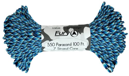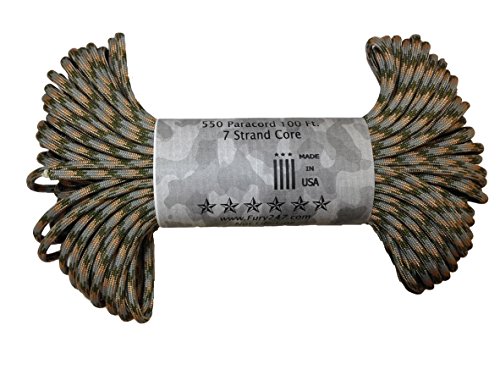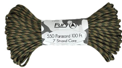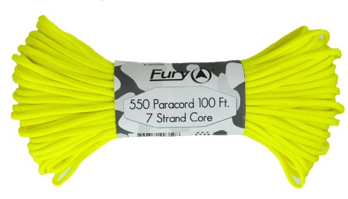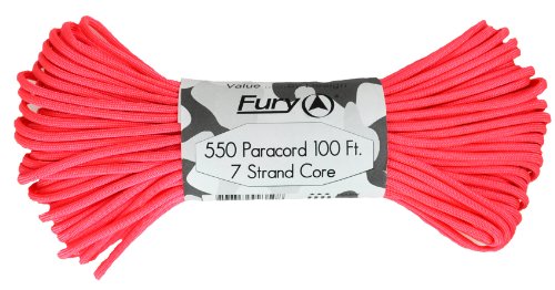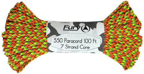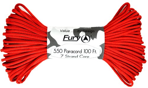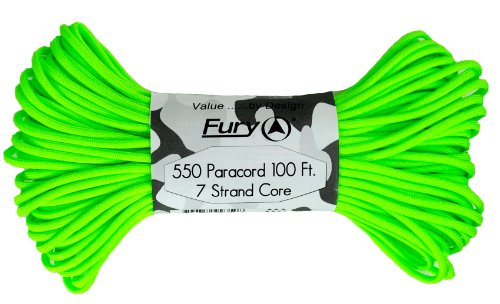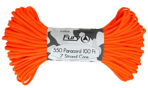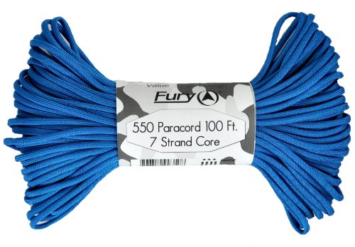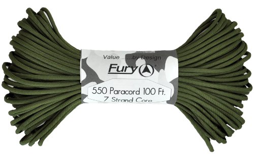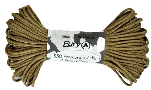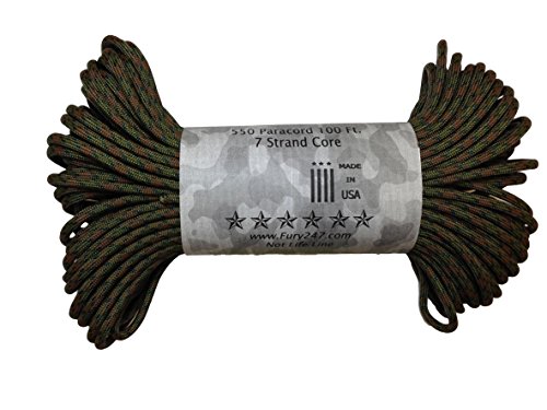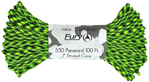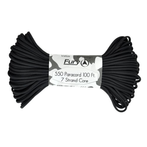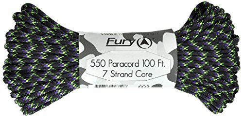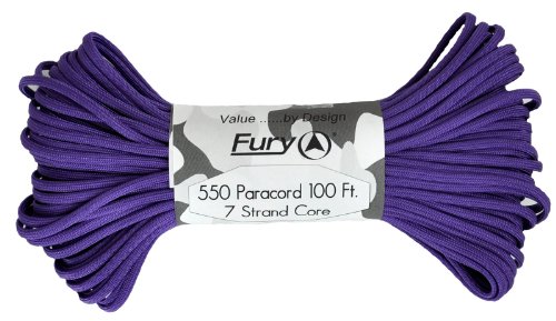 Don't be fooled by cheap paracord, Fury makes the original 550 Type III right here in the USA. Unlike inferior parachute cord, all Fury paracord consists of a seven strand core made with three separate strands. This stuff is tuff. Paracord is a must for camping, hiking, survival and millions of other uses including securing equipment, shoelaces, vehicle tie downs, sewing, repairing equipment, making a bow, making a shelter, fish gill nets, fishing line, animal snares, clothes lines, lanyards, anchor line, binding, adult recreation, restraints, tooth floss, splints, tourniquet, braiding, bracelets and other crafts. This 100' bundle is great addition to your survival kit or pack. Get the color you want; everything from our traditional and camouflage series to our Zombie apocalypse line. You will love it. Fury is a division of Joy Enterprise since 1941 and Proudly Made in the USA.Feature