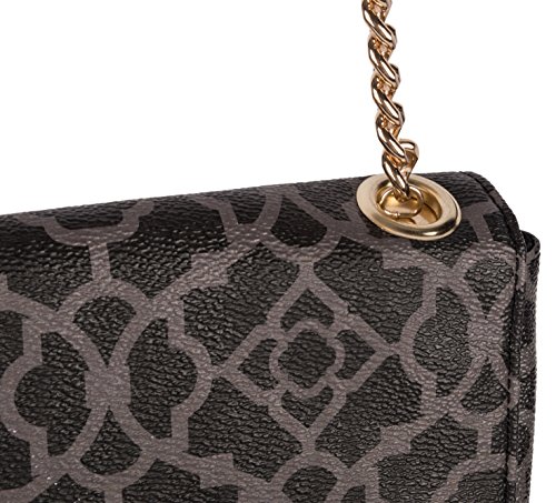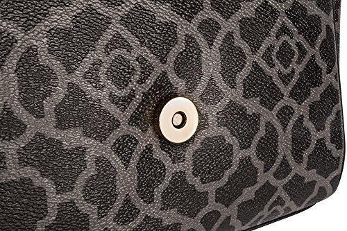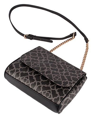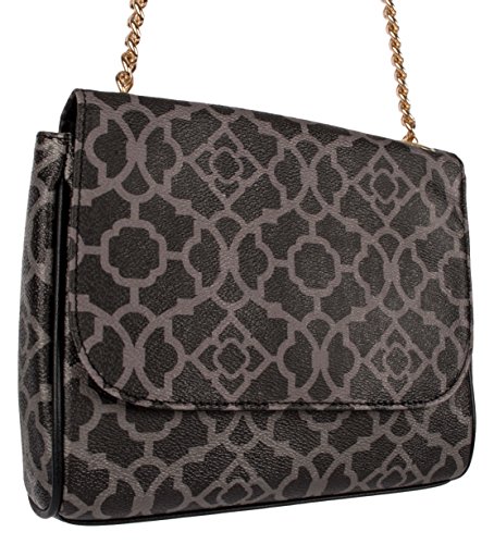 Elegant charcoal on black classic quatrefoil lattice, printed on an embossed pebble grain handbag. Flat crossbody shape; compact size is prefect for nights out on the town or a professional purse.