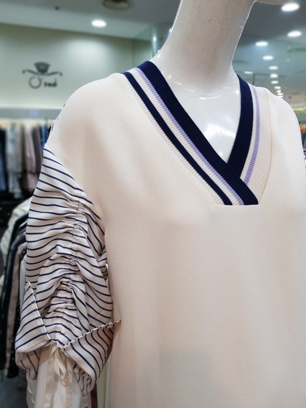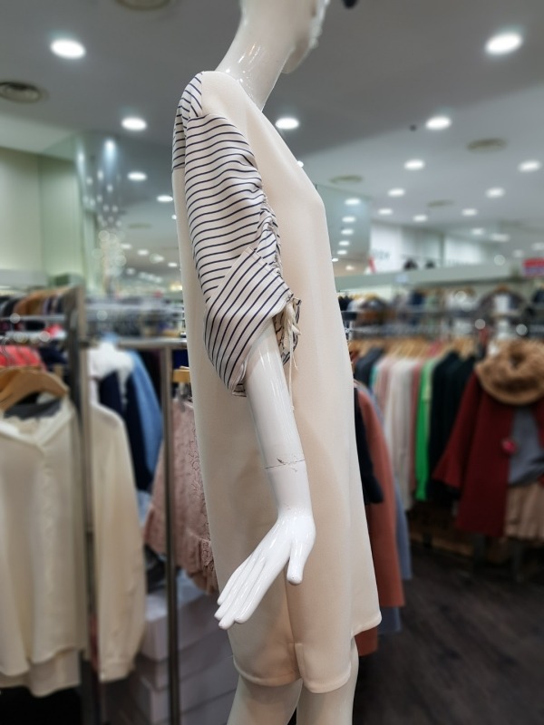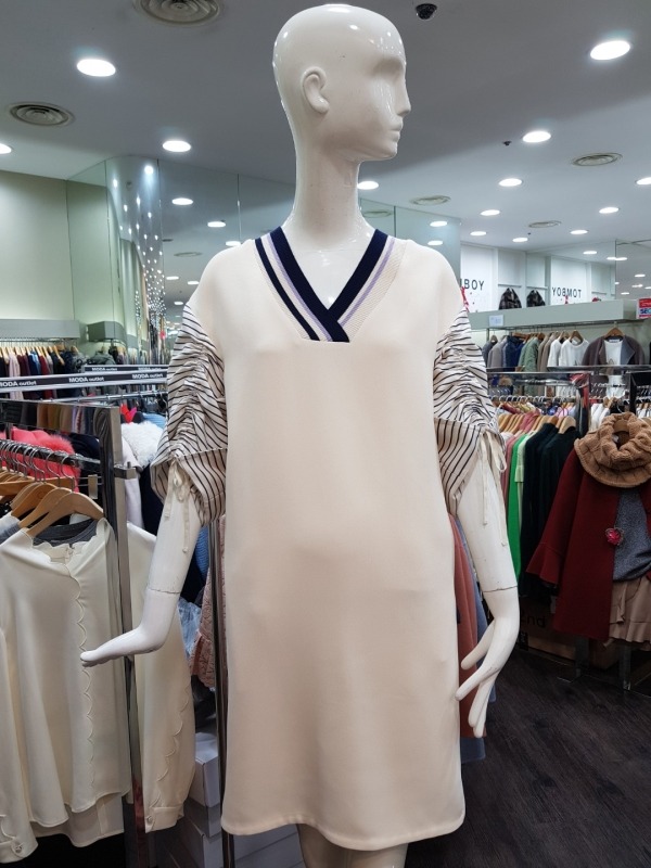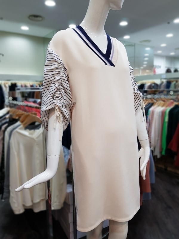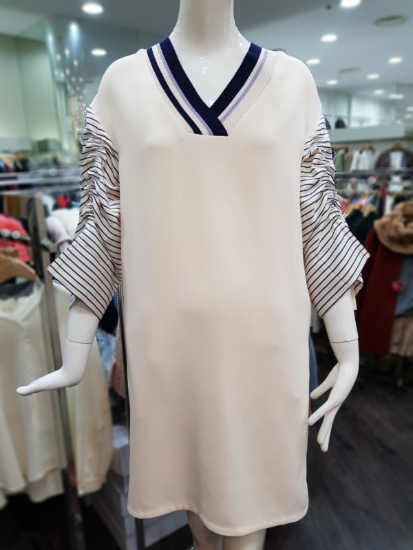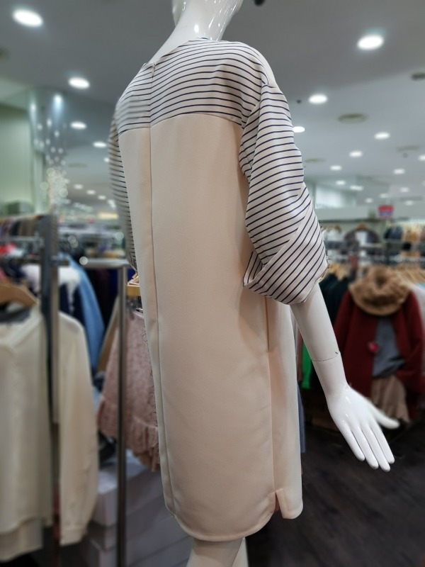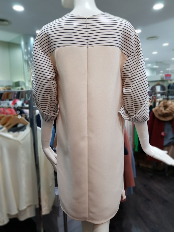 배색 스트라이프 패턴의 브이넥라인이 멋스러운 원피스로 후면 상단에 지퍼라인이 있어 탈착장이 편리하며,팔소매 안쪽에 길이 조절이 가능한 스트랩이 있어 다양한 스타일링이 용이합니다