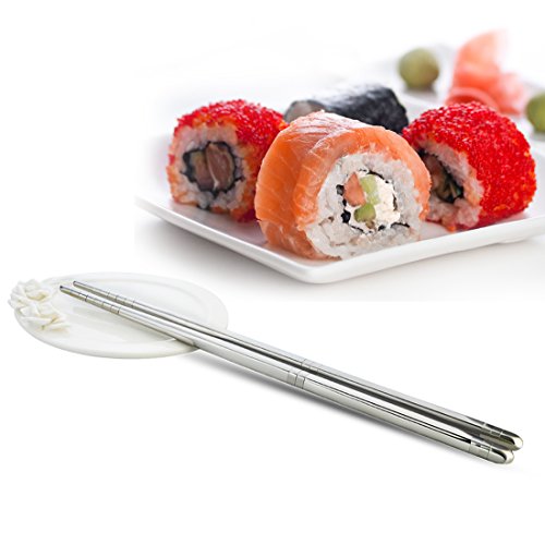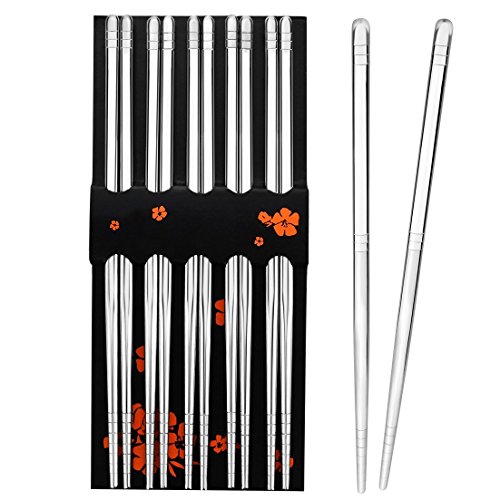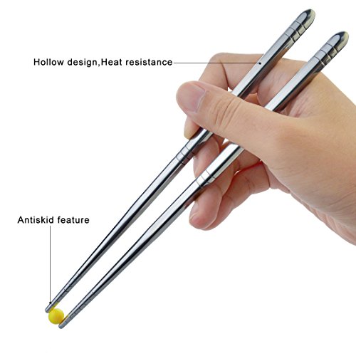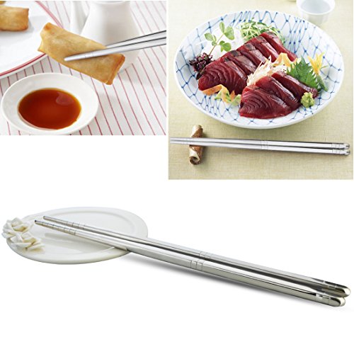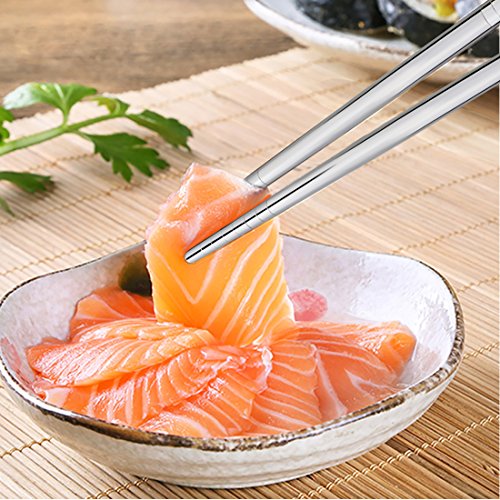 THE DIMENSION OF CHOPSTICKS: The length of our metal steel chopsticks is approx 8.9 inches. The upper part adopts 6mm square shape that can help you hold them easier. The item include 5 pairs which is suitable for family. It's a nice dishware for your daily use to have dinner. Resuable and very environment-friendly for eating Asian food instead of using disposable chopsticks, lightweight, safe and convenient for clean up.