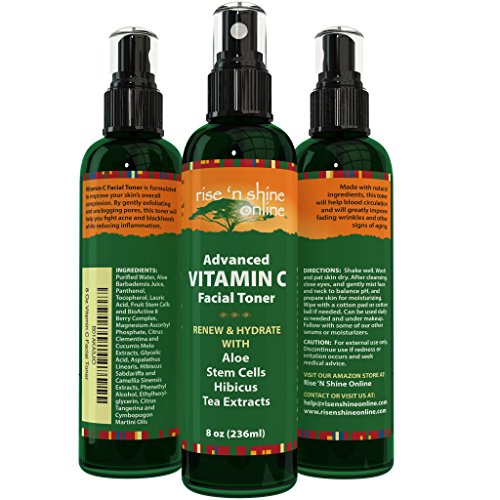 -. Binding : Health and Beauty -. Brand : Rise 'N Shine Online -. EAN : 0728461226615 -. Feature : CLEARS COMPLEXION - Vitamin C Facial Toner is formulated to improve your skin's overall complexion. By gently exfoliating and unclogging pores, this toner will help you fight acne and blackheads while reducing inflammation. / RESTORATIVE FUNCTIONS - Stem cells play an essential role in tissue renewal. Stem cells help with restorative functions, including cellular regeneration and may enhance the capacity to repair anti-aging. They have the amazing ability to develop into many different types of cells. Applying this toner that contains stem cell extracts derived from plants or fruits, may encourage your own stem cells and trigger their anti-aging effects. / POWERFUL ANTI-AGING - Vitamin C is a vital component when it comes to developing healthy and youthful skin in both men and women. Vitamin C encourages the production of collagen giving your skin a tighter and younger look. Made with all natural organic ingredients, this toner will help blood circulation to fight wrinkles and other signs of aging. / SKIN HYDRATION - Our toner includes Aloe Vera, which is what makes sure the toner won't dry out your skin. Aloe provides hydration on its own and allows even more to be absorbed when followed up with a moisturizer. The spray pump device makes for easy dispense onto your skin. / BACKED BY 30 DAY NO HASSLE GUARANTEE - Your purchase today is risk-free. If you're not completely satisfied let us know for a full refund. (BONUS!) The Uses and Benefits Ebook - INCLUDED AS A DOWNLOADABLE PDF WITH EVERY PURCHASE. Click the Add to Cart button now to order your own Vitamin C Facial Toner today! -. IsAdultProduct : 0 -. Label : Rise 'N Shine Online -. Manufacturer : Rise 'N Shine Online -. Model : Vitamin C Toner -. MPN : Vitamin C Toner -. PackageQuantity : 1 -. PartNumber : Vitamin C Toner -. ProductGroup : Beauty -. ProductTypeName : BEAUTY -. Publisher : Rise 'N Shine Online -. Studio : Rise 'N Shine Online -. Title : Vitamin C Facial Toner (8 oz) with Aloe Vera, Green Tea Extract, Vitamin B5, Vitamin C and Vitamin E - Advanced 100% All Natural Organic Anti Aging Pore Minimizer for Face, Skin and Neck -. UPC : 728461226615