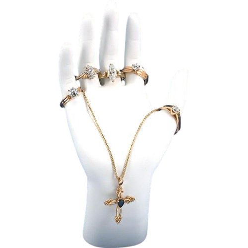 -. Binding : Kitchen -. Brand : FindingKing -. Color : White -. Feature : This is a new white polystyrene hand display / Hang necklaces or bracelets off of this hand display and immediately draw your customers attention to them / This is great to display jewelry at a show on in your store / It measures approximately 3 1/2" x 6 1/2" (89 x 165 mm) -. Model : TH-233W -. MPN : 65619126 -. PartNumber : 65619126 -. ProductGroup : Jewelry -. ProductTypeName : FASHIONNECKLACEBRACELETANKLET -. Title : White Elegant Hand Display Ring Bracelet Jewelry Stand 6.5"