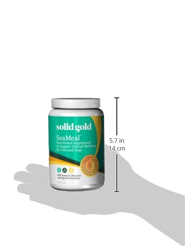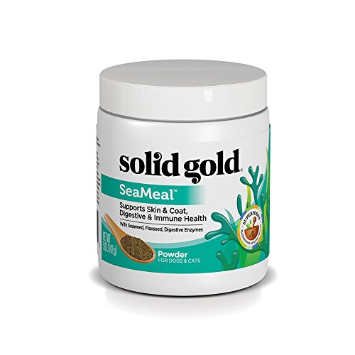 Solid Gold SeaMeal Kelp-Based Daily Wellness Supplement provides support for skin and coat, digestive and immune system health in dogs and cats. Utilizing seaweed, earth’s original Superfood, Solid Gold SeaMeal combines red, green and brown seaweed species to deliver transformational health benefits for dogs and cats. Sourced from the coast of the United States, this carefully selected blend of seaweeds provides an excellent source of iodine and chlorophyll to provide important essential vitamins, minerals, amino acids and antioxidants for skin and coat health. Since coat and skin issues and digestive issues often go hand-in hand, digestive enzymes are added to support digestive health. Rich in Omega-3 Fatty Acids, flaxseed meal is included to provide additional support for skin and coat health. Add this easy-to-use powder to your pet’s meal twice daily; add dry powder directly to their meal or mix with water to form a paste before adding to their food. Grain and gluten-free. No artificial colors, flavors or preservatives. Made in the USA.Feature