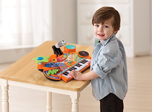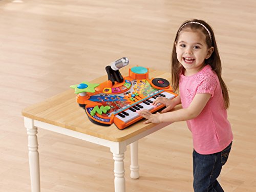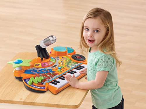 - Kids music toy teaches pretend play, instruments, creativity and music; explore a variety of sounds including drums, a scratch disc and a whammy bar