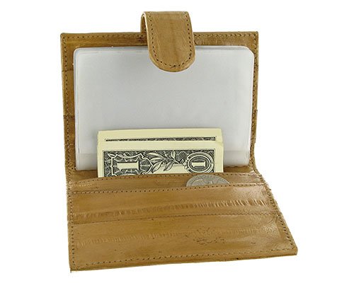 Product Description Smooth Eel Skin Credit card holder Wallet. Dimension is 3.25" X 4" when closed and 6" x 4" when opened.