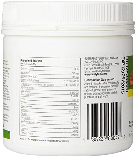 -. Feature : Has your senior cat lost his vitality? Does your feline suffer from stiff joints, dulling fur, digestion disorders? WellyTails veterinarian formulated nutritional cat supplement can help your feline friend regain their energy, correct digestive disorders and loosen their joints while giving them nice shiny coats and bright eyes. And because it tastes good, your cat will lick the bowl clean! / The WellyTails supplement includes all the necessary vitamins and minerals needed for senior cat care, health and proper digestion, such as high amounts of DHA and EPA Omega-3 for support of brain, eye and nerve development; Probiotic bacteria and Digestive Enzymes to aid in food digestion; and skin and glossy fur support from ALL 3 of the Omega-3s. / Cancer fighting Phytonutrients, Antioxidants and Vitamins, cranberry extract to provide urinary tract heath support, Taurine for heart health, L–carnitine for weight and energy management, and Glucosamine HCl for joint health support round out the included nutrients in this veterinarian grade cat supplement. / Whether you're needing a supplement for a raw food diet, nursing an elderly cat back to health, or just want to increase your cat's longevity, the WellyTails Senior Cat Nutritional Supplement will provide the vitamins and minerals that your feline friend needs. / Made in the USA from the highest grade ingredients, you can be assured that your furbaby is getting the best nutritional support possible when you give them WellyTails supplements. Purchase your cat supplement today so your senior cat can start benefiting from better health now.
