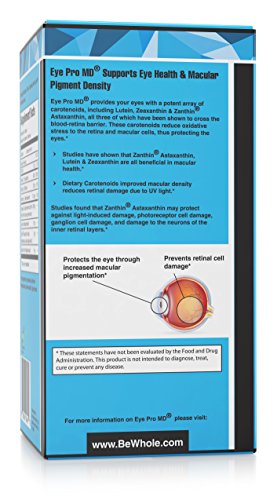 Potent Carotenoid Formulation for Optimal Eye Health: Eye Pro MD combines Earths most potent and effective Carotenoids for Eye Health. The Astaxanthin, Lutein & Zeaxanthin within Eye Pro MD work along different pathways to improve and preserve eye function and health.