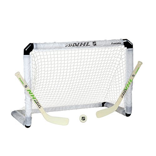 Studio : Franklin Sports Publisher : Franklin Sports Binding : Misc. Product Description Light-Up Mini Hockey goal with rugged high-impact 1.25 plastic tubing Dimensions: 28 (w) x 20 (h) x 18 (d);Durable 900D polyester all-weather pre-fit net;Includes two glow in the dark mini hockey sticks (1/RS, 1LS), One soft molded 2 Glow in the Dark mini ball;Easy assembly 420D nylon sleeve attachment;Requires 6 AAA batteries (not included) 0