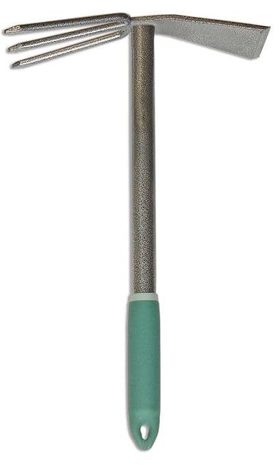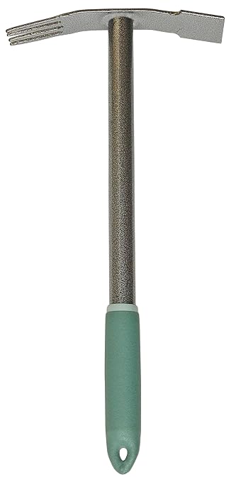 - Beveled edge efficiently cuts roots, then the tapered tines lock and hold the weed