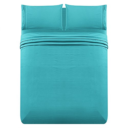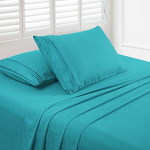 Luxe Manor 3pc Twin Size Bed Sheet Set - Soft Brushed Microfiber Fitted Flat Sheet & Embroidered Pillow Case Set - Deep Pocket Wrinkle Free Hypoallergenic Bedding, Best Christmas Gifts, Teal