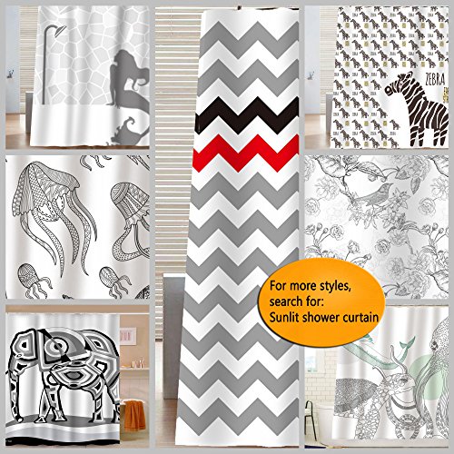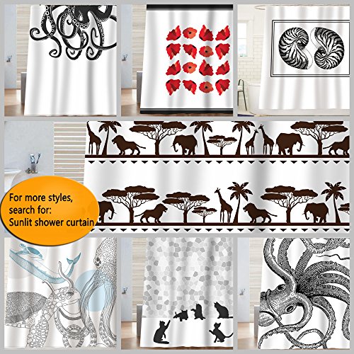 Sunlit Design Black Cat Silhouette and Gray Mosaic Fabric Shower Curtain. Grey and White