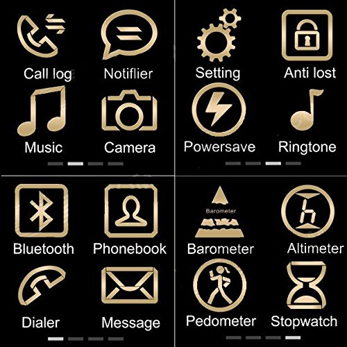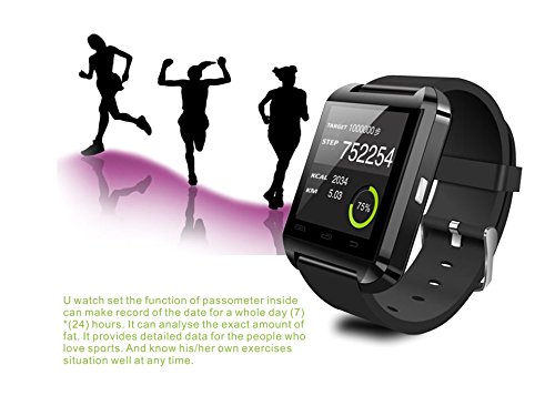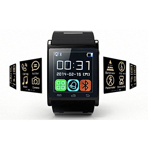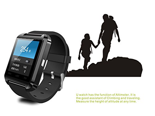 -. Feature : Discover U-Watch Smart Watch, a sleek and minimalist smartwatch that brings your phone to your wrist via Bluetooth / With its color touchscreen, integrated microphone and speaker, U-Watch acts as a wireless dialer, allowing users to handle calls directly from their wrist. / Compatible with all Bluetooth devices, U-Watch also syncs with Android 2.3+ and iOS 4.0+ smartphones to download phonebook and call history. / U-Watch also features a built-in pedometer that tracks your daily steps and calories burned. U-Watch will help you stay motivated and active throughout the day! / Touch Screen | Time | Calls | Caller ID | Message | Notification | Remote Camera Shutter | Music | Phonebook | Anti-lost Alert | Built-in Mic & Speaker | Ringtone & Vibration | Pedometer | Altimeter | Barometer | Stopwatch |