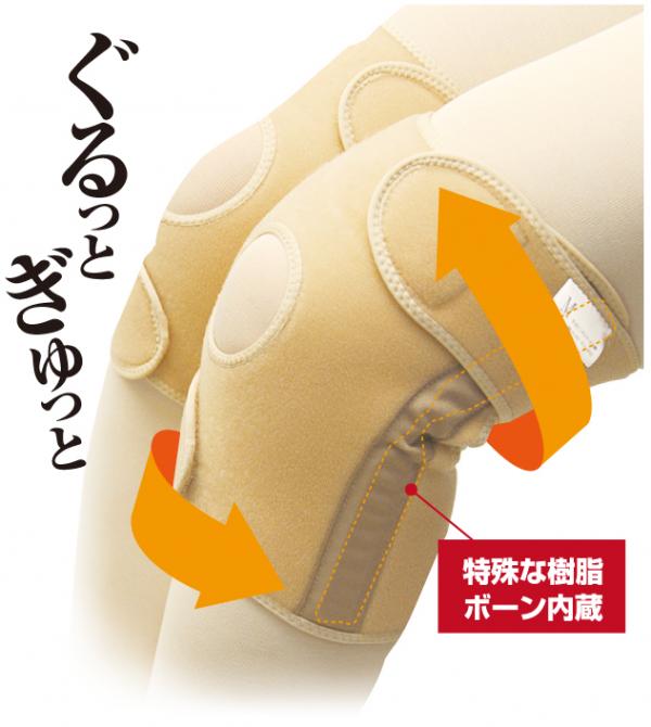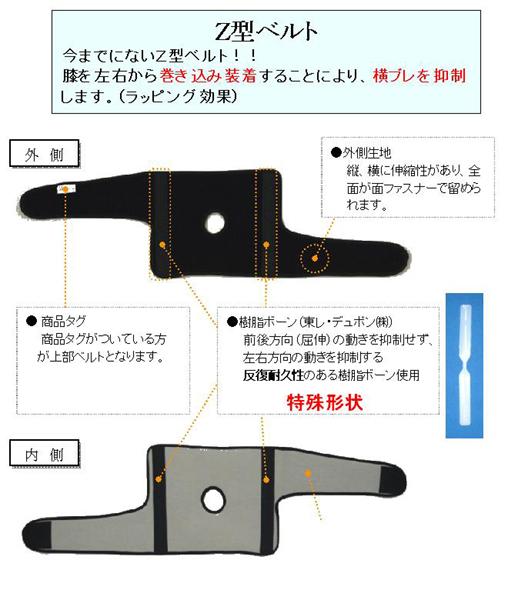 | 今までにないZ型ベルト!膝を上下のベルトで逆方向からグルッと巻き込む、今までにない形。更に膝の脇に内蔵した樹脂ボーンは、細くくびれた箇所が膝の曲げ伸ばしに合わせ変形する特殊な形状。表面どこにでも面テープが止めれる為、装着が簡単で微調整も可能です。 |