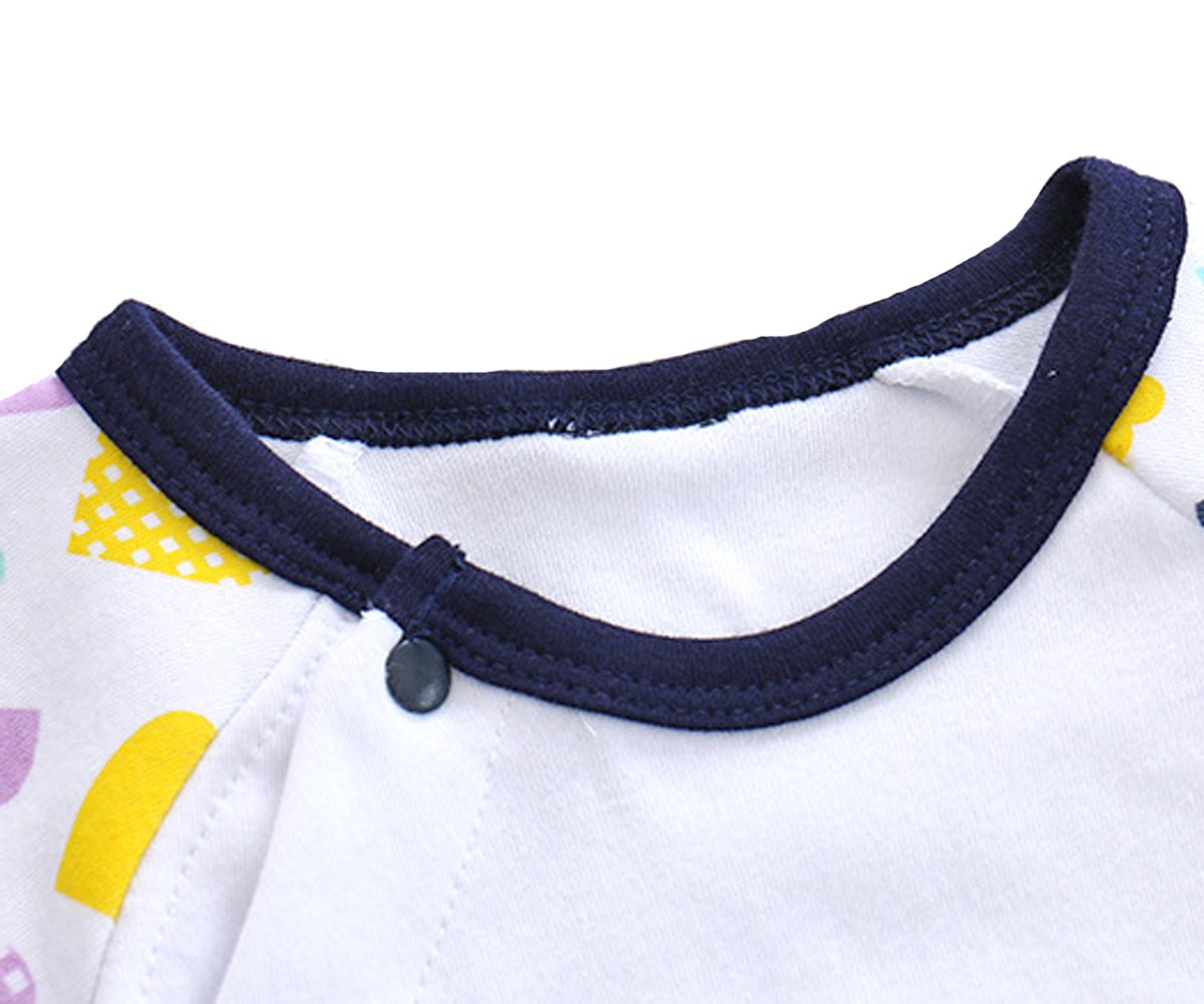 前開き、股下もスナップのデザイン、着替えやおむつ替えに便利