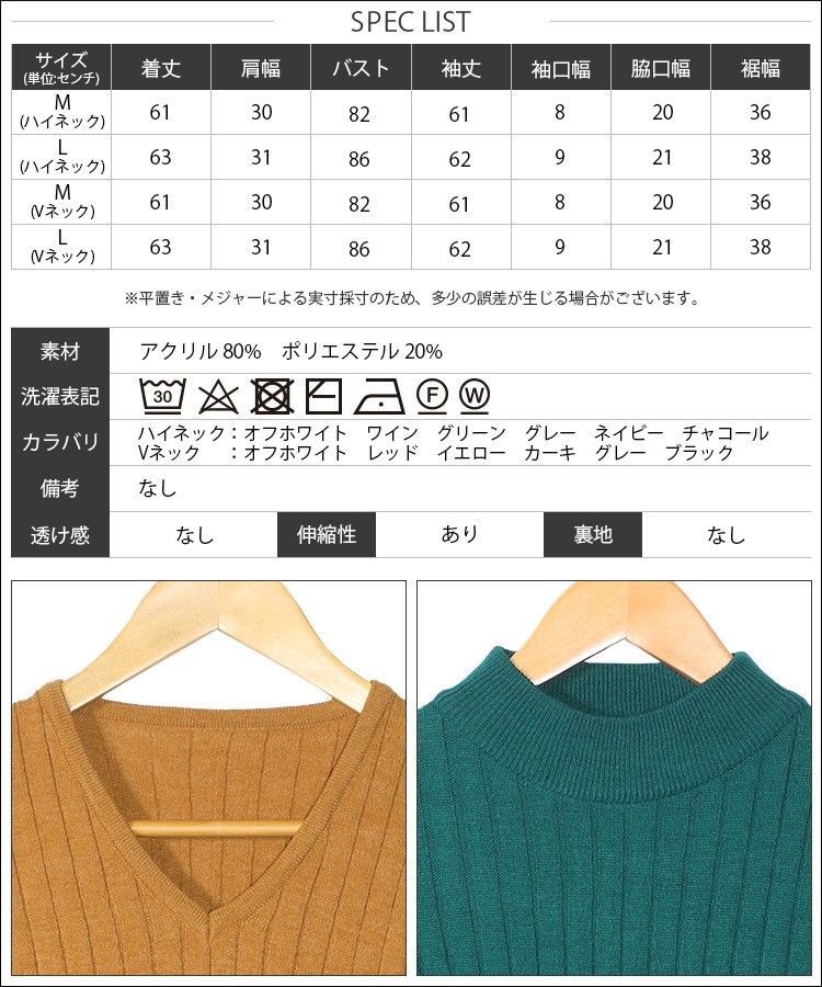 L(Vネック):着丈 63cm 肩幅 31cm バスト 86cm 袖丈 62cm 袖口幅 9cm 脇口幅 21cm 裾幅 38cm
