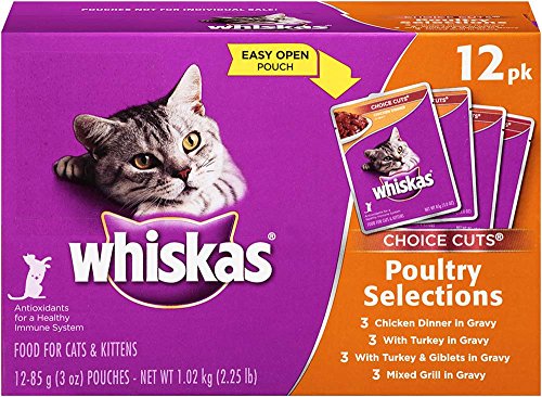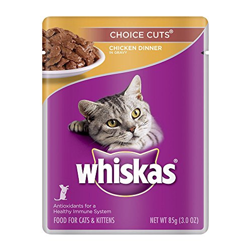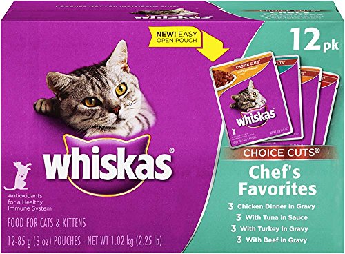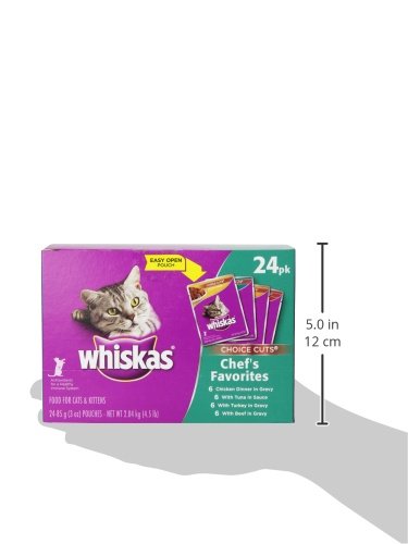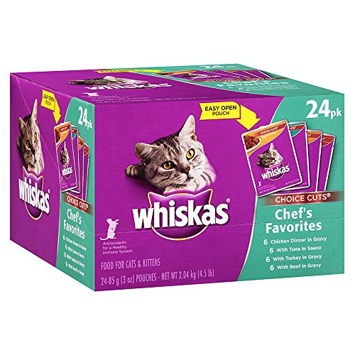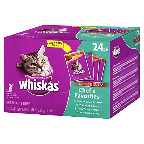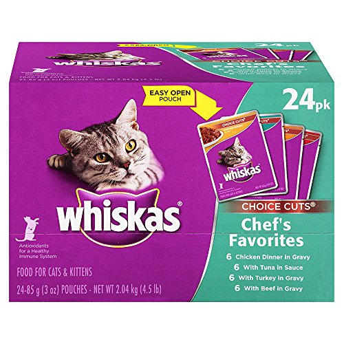 Contains (1) 24-count box of 3-oz. WHISKAS CHOICE CUTS Chef's Favorites Variety Pack Wet Cat Food, including Chicken Dinner in Gravy (6), With Tuna in Sauce (6), With Turkey in Gravy (6), and With Beef in Gravy (6) Flavors