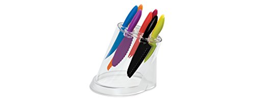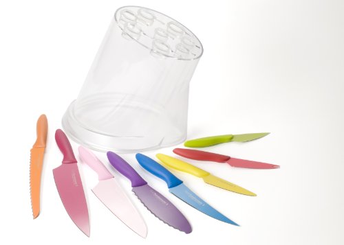 Also includes 3-1/2-inch paring, 6-inch utility, 5-3/4-inch sandwich, and acrylic storage block; color-coding prevents cross contamination