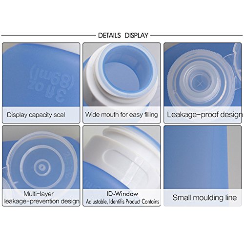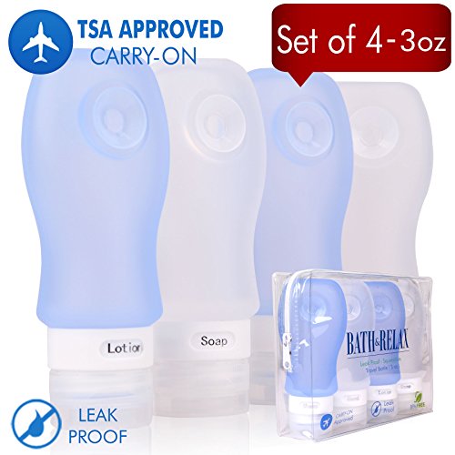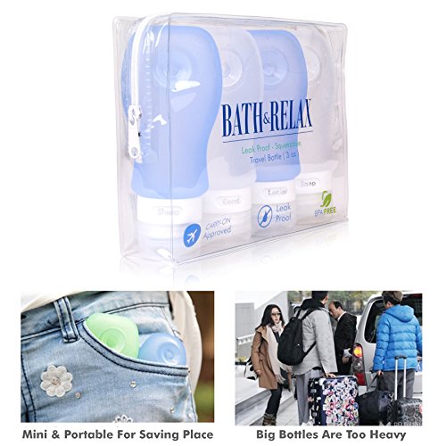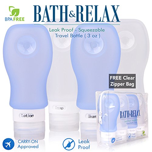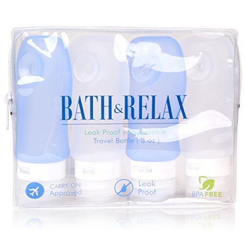 -. Binding : Health and Beauty -. Brand : Bath & Relax -. Color : clear, blue -. EAN : 0747827099892 -. Feature : ✓ TSA APPROVED For Carry on Lage - Four Large 3oz ( 89 ml ) BOTTLES - High quality Durbale, Perfect For different toiletry products such as your Soap, Shampoo, body lotion, Face Wash, and Other Liquid Toiletries. FREE Clear Zipper Pouch Bag. / ✓ LEAK PROOF DESIGN SILICONE Toiletries : Each 100% BPA Free Food Grade Silicone Bottle ( FDA Approved ) has been created not to leak when travelling. Can also be used for Syrups, Ketchups, Salad Dressing, etc. Perfect for Traveling, Outdoors, at the Gym, and much more Situations. / ✓ SQUEEZABLE, REFILLABLE, Soft and Pliable. Easy to Squeeze. Easy to Refill. Screw top and wide opening for easy filling, flip-top cap for easy dispensing. Very Eco- Friendly / ✓ ID WINDOW, EASILY IDENTIFY CONTENTS. Each bottle has a rotatable ID WIndow so you can change the text that shows. / ✓ BUILT-IN SUCTION CUP & Comes with Clear Pouch Bag. Suck it on mirror or wall to squeeze out the shampoo / condition -. IsAdultProduct : 0 -. MPN : 4091229 -. PackageQuantity : 1 -. PartNumber : 4091229 -. ProductGroup : Beauty -. ProductTypeName : BEAUTY -. Title : Large Travel Bottles Leak Proof- 3 oz Set of 4 TSA Approved For Carry on Lage Squeezable & Refillable Silicone with Bag-Travel Size Accessories Containers Tubes BPA Free For All Liquid Toiletries -. UPC : 747827099892