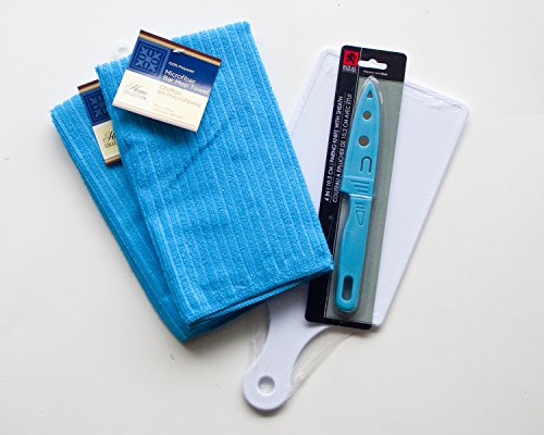 White Cutting Board and Bright Blue Knife and Kitchen/Bar Towels 4pc Bundle