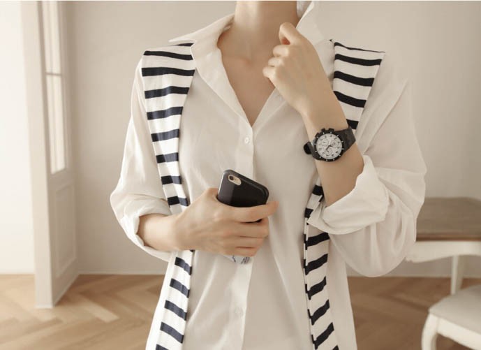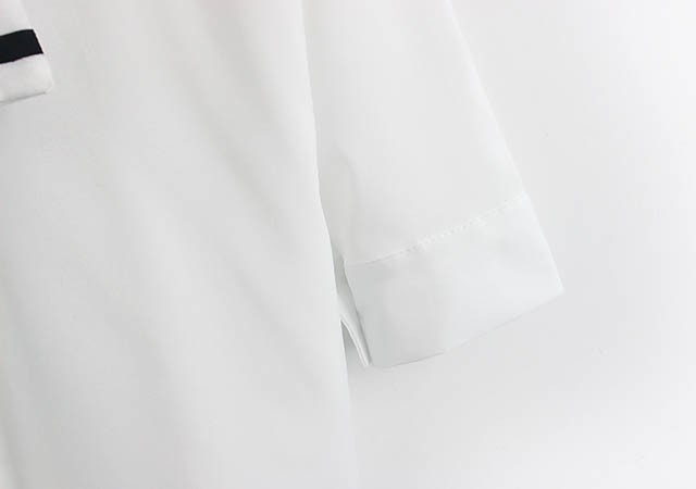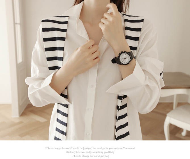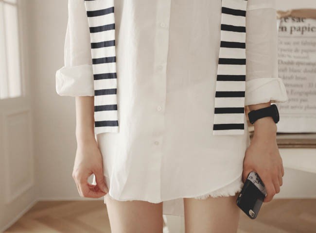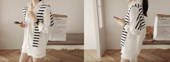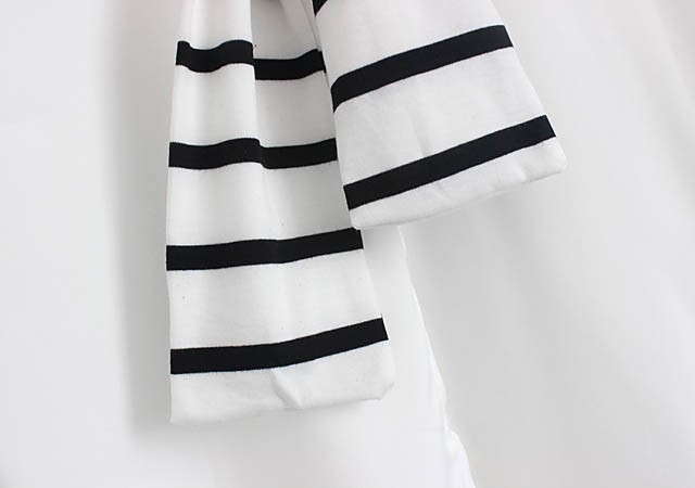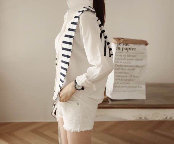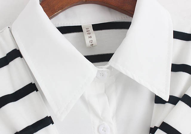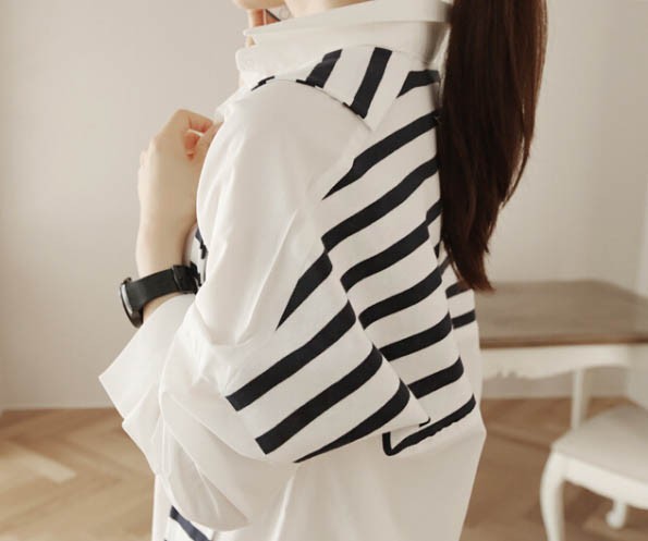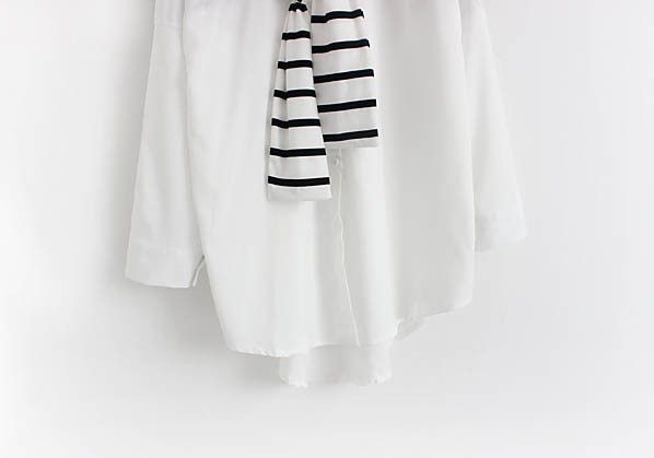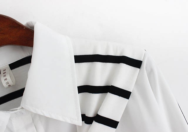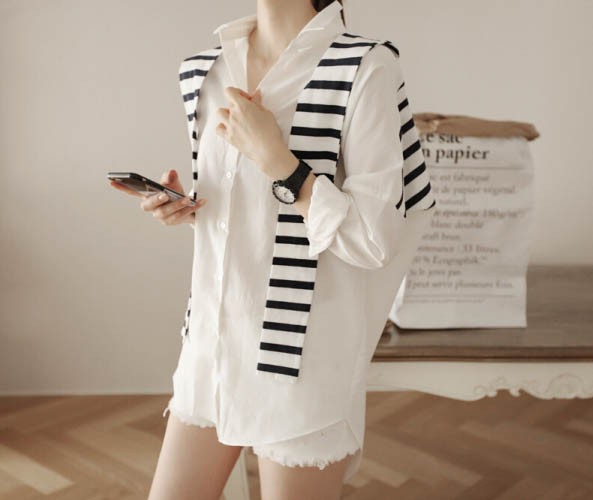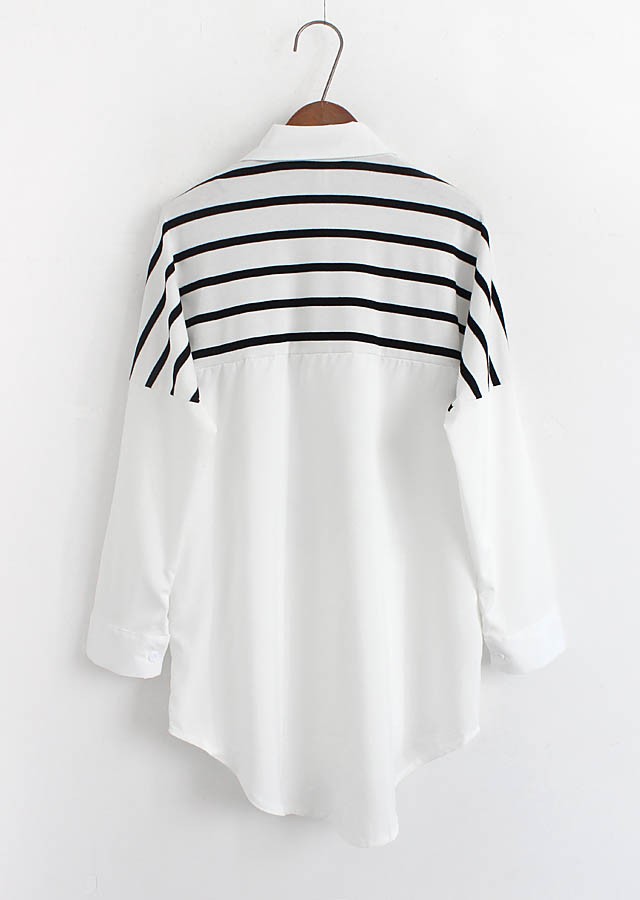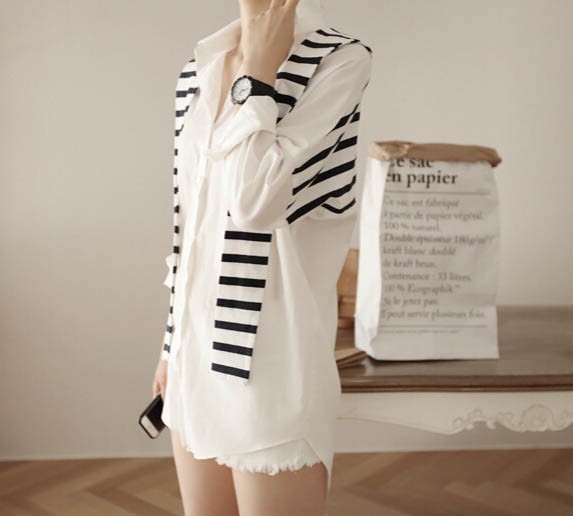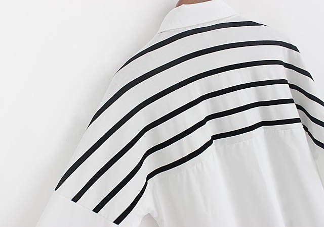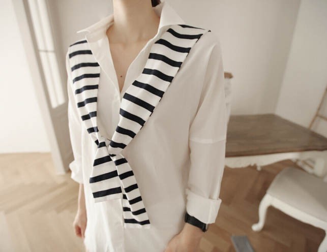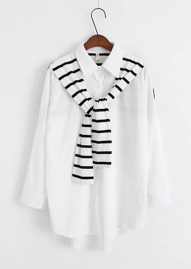 【入荷後営業日2,3日以内出荷予定 通関待ちや不良により出荷遅くなる場合はメールにてご連絡いたします。メール受信設定によっては正常に受信されない場合はございますので、 弊社からのメールを予め受信頂くようご設定くださいませ。】 トップス シャツブラウス ホワイトシャツ ストール ボーダー柄 縞 レディス レディース 春 新作フェイクレイヤードボーダーストール切替シャツ◆サイズ:着丈70肩幅73袖丈34胸囲102◆素材:綿混紡
