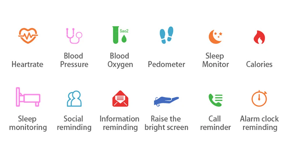Function:Blood Oxygen,Fitness Tracker,Message Reminder,Blood Pressure,Call Reminder,Passometer,Alarm Clock,Sleep Tracker,Heart Rate Tracker,Push Message