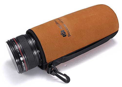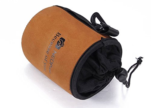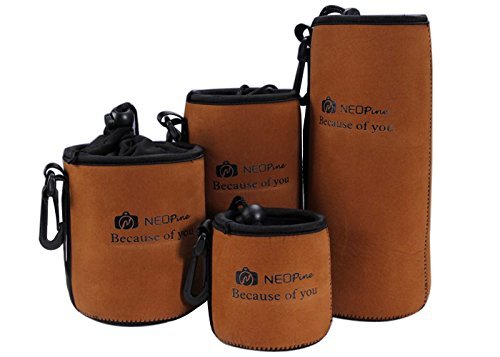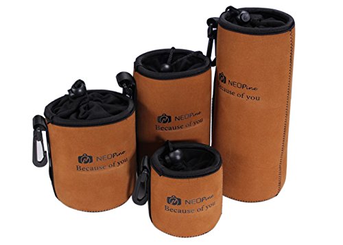 NEOpine [4 Pack] Elastic Neoprene Lens Pouch Storage Protective Barrel Bag for Canon Nikon Pentax Olympus Sony + MicroFiber Clean Cloth - Brown
