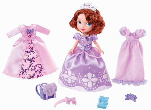 -. Feature : Based on the hit new animated series from Disney Junior, Sofia the First / Sofia doll comes in her signature purple full-length gown with a sparkly, sheer pink peplum / For more formal occasions, a second gown in shimmery pink is the perfect fashion in which Sofia can shine like a P.R.Incess / When the day's events are over, Sofia can get her P.R.Incess rest in a soft purple nightgown with ruffle trim and bow / Includes Sofia doll in gown, two additional fashions, backpack, book, headband, hairclip and tiara