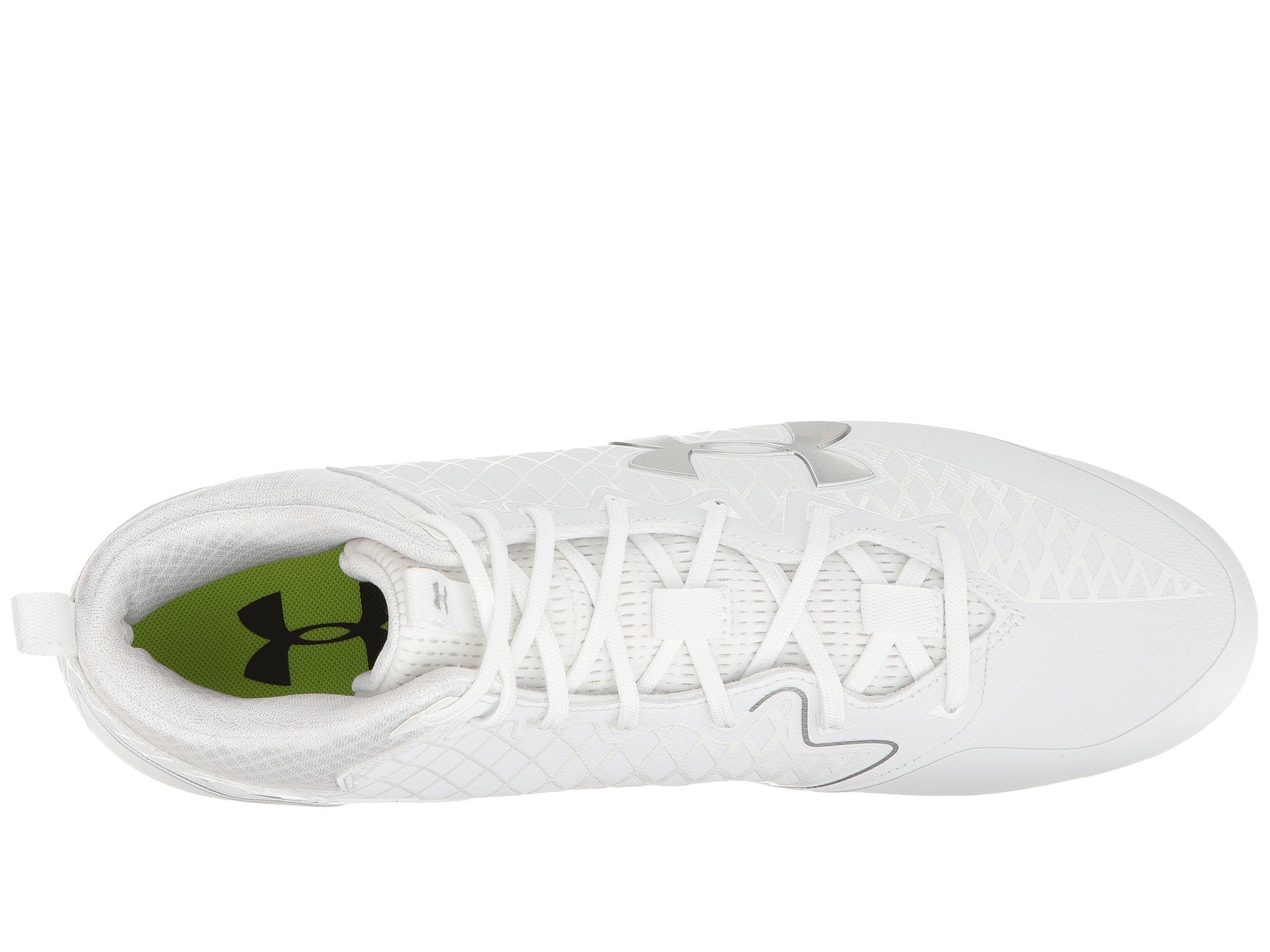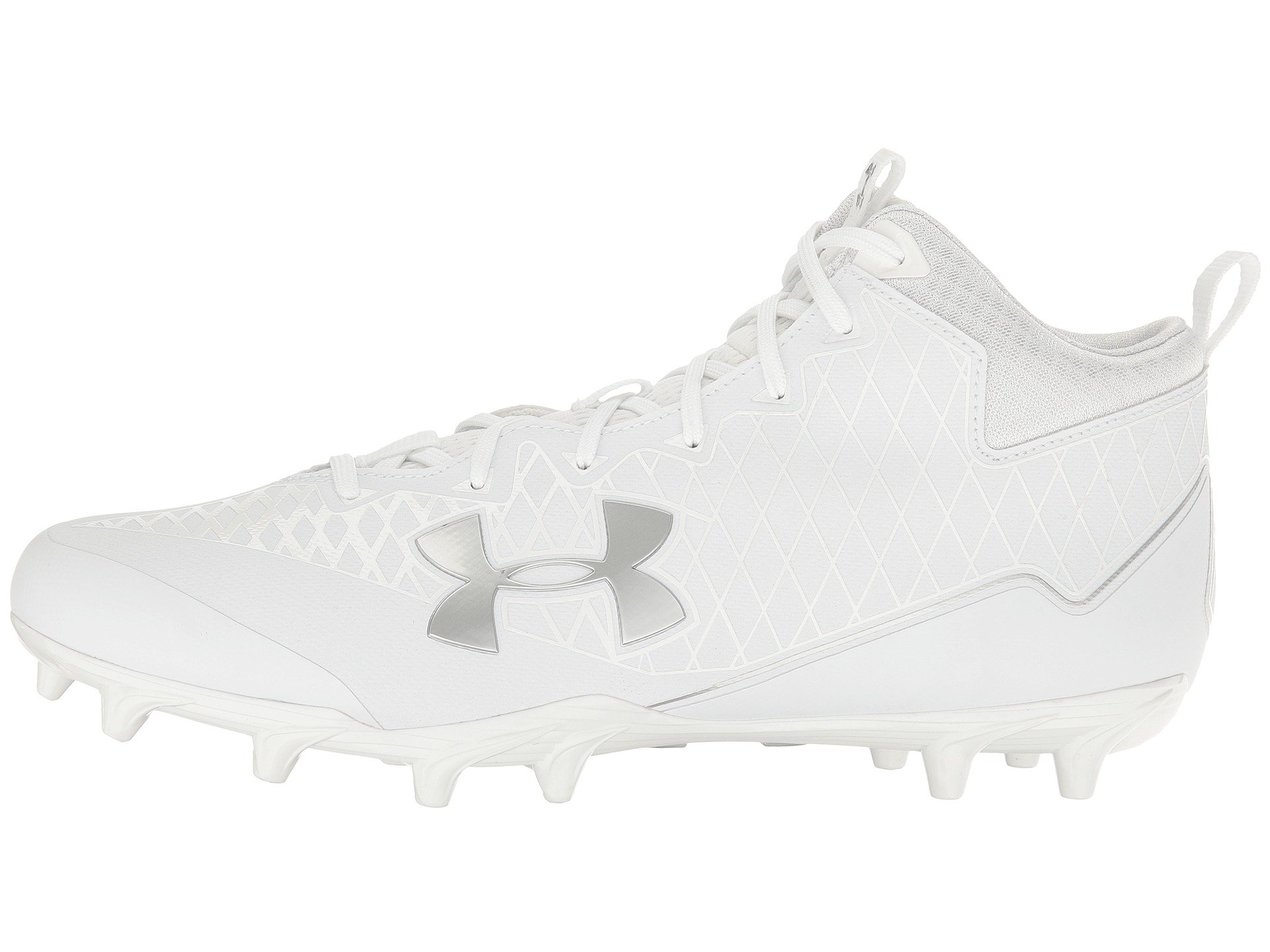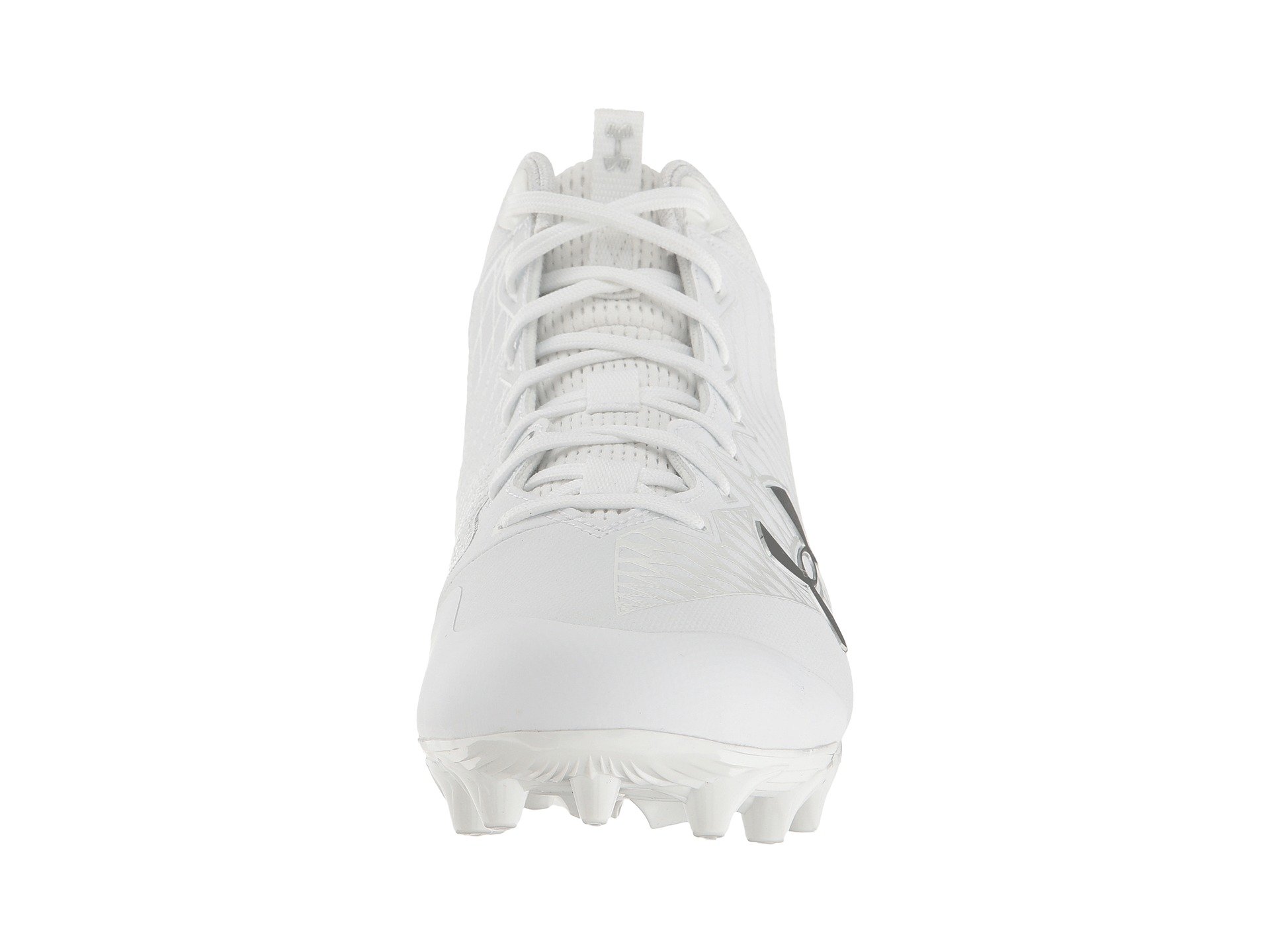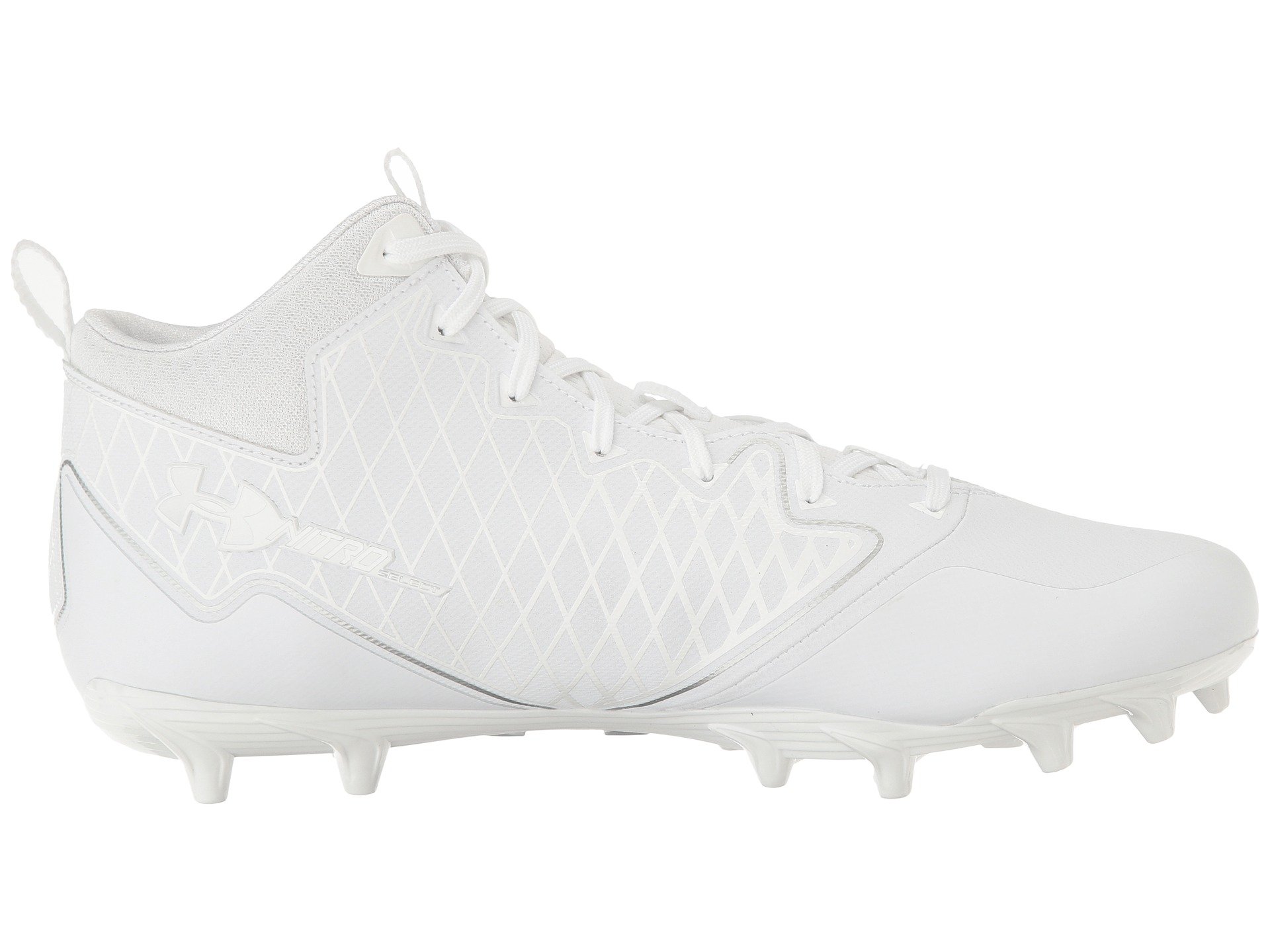 | Product Information SKU: #8860753Take each step in stride and success on the fields with the Under Armour? UA Nitro Select Mid MC!Coated textile upper with pattern. Mid-top silhouette.Centralized lace-up closure for a snug, adjustable fit. Padded tongue and collar.Pull tab at tongue for easier on and off wear.UA ClutchFit™ technology wraps the foot and ankle like a lightweight second skin for enhanced support and a great fit. Soft fabric lining.Molded 4D foam footbed reduces cleat pressure.Molded TPU plate with cleats offer traction as well as quick cuts on synthetic surfaces.Imported.Product measurements were taken using size 12, width D - Medium. Please note that measurements may vary by size.Weight of footwear is based on a single item, not a pair.Measurements: Weight: 13 oz |