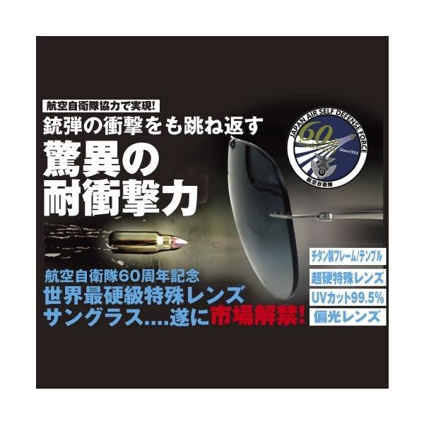 航空自衛隊協力で実現!銃弾の衝撃も跳ね返す脅威の耐衝撃力サングラス遂に登場!航空自衛隊60周年記念・世界最硬級特殊レンズサングラス...遂に市場解禁!空に夢を抱く、男のロマンを感じさせる王道のティアドロップ・グラス! 特殊機関・SP・有名人・アスリートにまで及ぶ予約殺到サングラス! 一見しても解らない、驚異の特殊レンズを持つパイロットサングラス! 眼を危険障害から守り、視界も偏光レンズ・UVカットで紫外線をシャットアウトし、良好にする! 頼れるスーパー・プロテクトサングラス!! 特殊部隊仕様のハイスペックレンズ採用! 『防弾性』直径6.55mmの鉄球が時速171kmで衝突しても・・・ 『防刃性』尖った鋭い鉄500gを1.27mの高さから落下させても・・・ ・・・レンズはクラッシュしない耐久テスト合格実績! ・チタン製フレーム/テンプル ・超硬特殊レンズ ・UVカット99.5% ・偏光レンズ