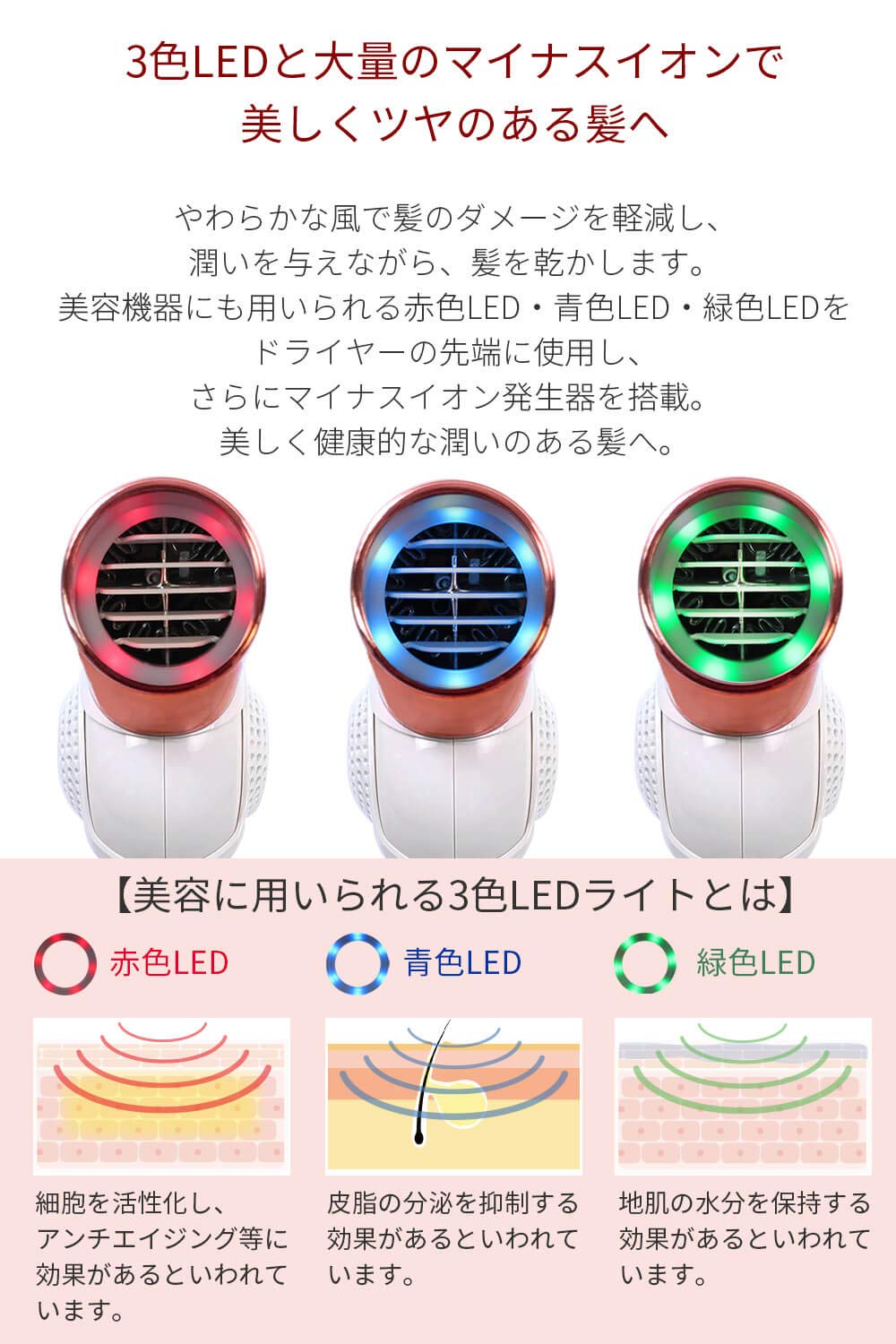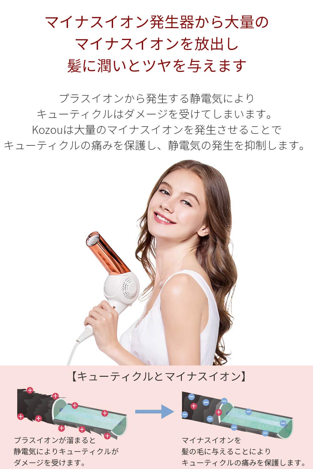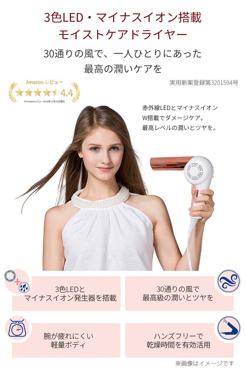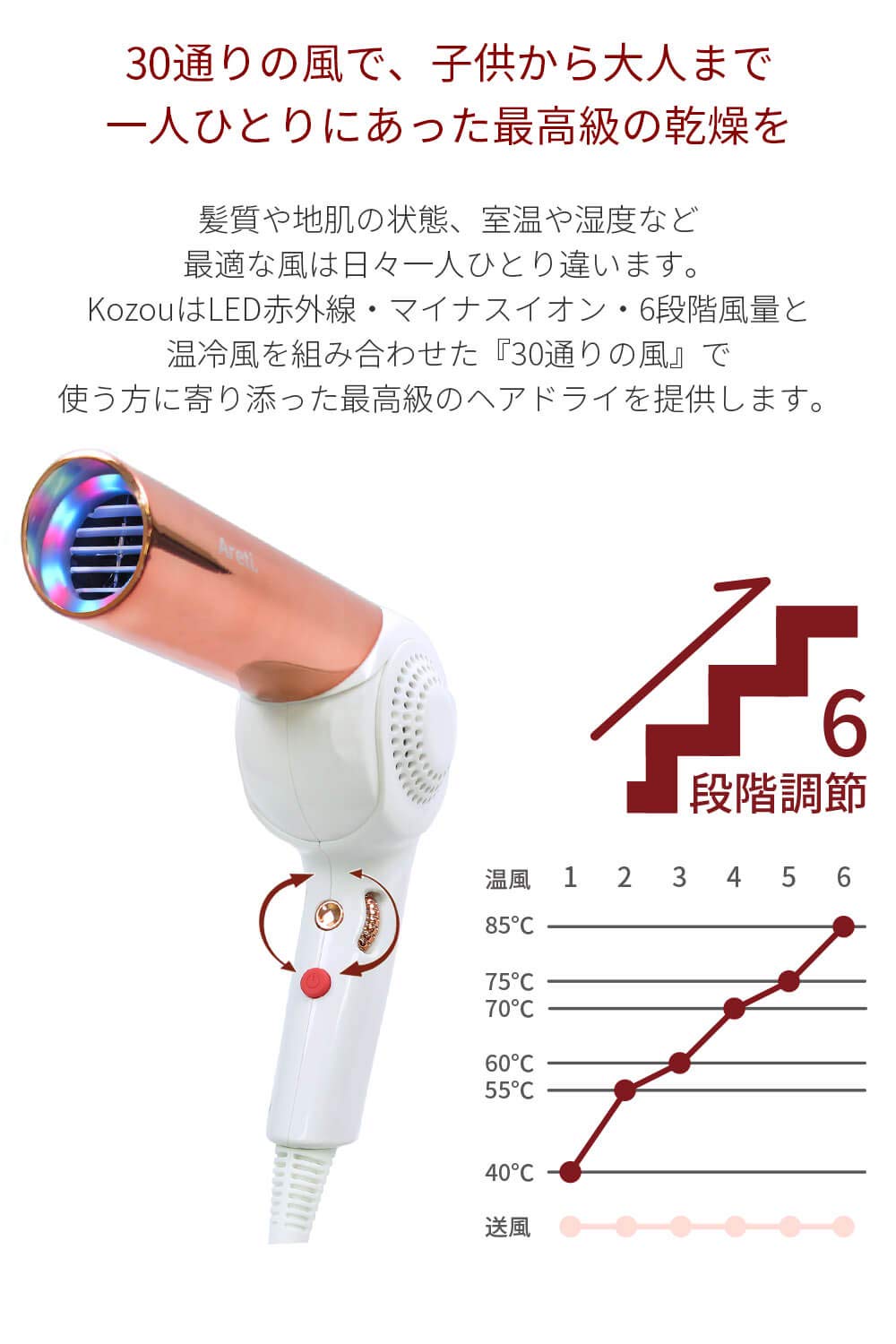 ●3色LEDとマイナスイオンを搭載した、【Areti アレティ】モイストケアドライヤー Kozou。日本人の繊細な髪質に寄り添った30通りの風を実現。お子様からご年配の方まで、髪の傷みを軽減してツヤと潤いを与えます。