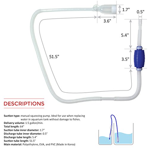 Feature : This is original Aquarium Cleaner Siphon Pump. Don't be fooled by lesser quailty Made in China imitations. / Manual Siphon Pump. Total Length: 65". / Drains up to 1.5 gallons a minute / Ideal for use when replacing water in aquarium tank without damage to fishes / Unique filter allows dirt in sand to be discharged along with water
