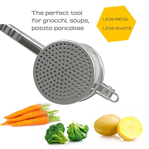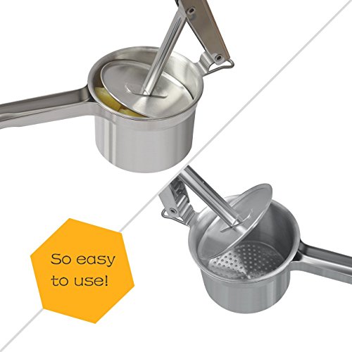 - ❤ RELIABLE STAINLESS STEEL CONSTRUCTION WITH STRESS-FREE MECHANISM: Crafted from robust stainless steel with brushed finish that is guaranteed to resist stains, odor, flavor, rusting, corrosion, tarnishing, and deformation. With perforated fine mesh stainless steel strainer prevents pulp from slipping through. The metal plate presses into peeled boiled potatoes releasing small air-infused particles for instant fluffy mashed potatoes without scratching your bowl.