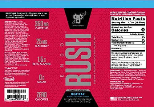 ReleaseDate : 2017-10-02 Studio : BSN Publisher : BSN Binding : Health and Beauty Product Description Getting to the top requires unrelenting discipline from within. The ancient Greeks called this "Endo" - meaning internal. We call it ENDORUSH, a pre-workout designed to help fuel the internal drive of performance athletes ready to rise to the challenge ahead. Armed with only necessary ingredients. Equipped with a 100% transparent label. ENDORUSH is the most advanced pre-workout by BSN ever for athletes seeking a powerhouse of flavor plus energy, focus and performance. Featuring 350mg of Caffeine, 25mg of Teacrine and 1.5g of Beta Alanine, ENDORUSH helps deliver the ultimate rush on the go-or wherever greatness takes you. A new era in performance starts now. 0