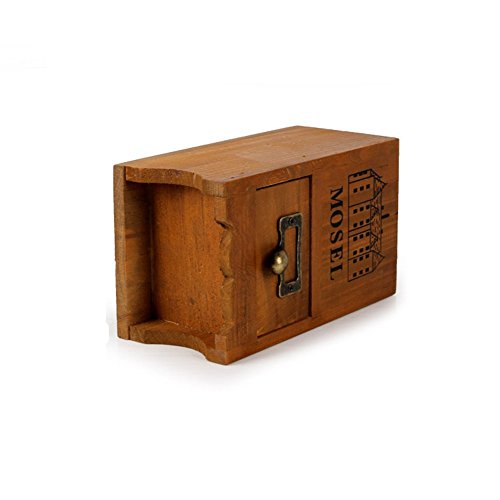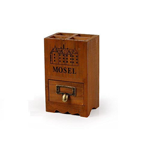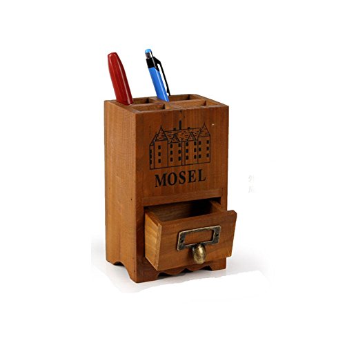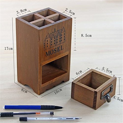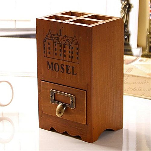 Chris.W 1Pcs Vintage Country Rustic Brown Wood Office Desk 4-Compartment Pencil/Pen Holder Organizer w/ Pull-out Storage Drawer for Small Items