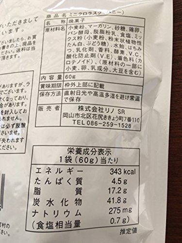 原材料:小麦粉、マーガリン、砂糖、鶏卵、パン酵母、脱脂粉乳、食塩、ミックス粉(小麦粉、粉末状植物性たん白、ぶどう糖)、水飴、はちみつ、乳化剤、香料、酵素、V.C、酸化防止剤(V.E)、着色料(カロテノイド)、(原材料の一部に小麦、卵、乳成分、大豆を含む)