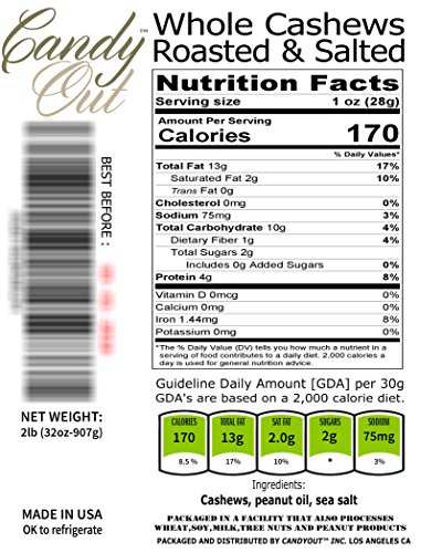 CandyOut Extra large Whole Jumbo Cashews Roasted Salted 2 Pound - 32oz in sealed stand-up bag