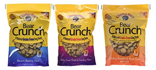 Charlee Bear products continues its tradition of dog treats with a healthy purpose. At less than 3 calories each you can feel good treating your dog for training or just for fun. They're pocket perfect. Bear crunch is made to provide a special light crunch dogs love. We combine the tastes of chicken and pumpkin with the sweetness of apples. You and your dog will love bear crunch! this is a variety pack Containing 1 bacon & blueberry flavor and 1 turkey, sweet potato & Cranberry flavor and 1 chicken, pumpkin and Apple flavor.Feature
