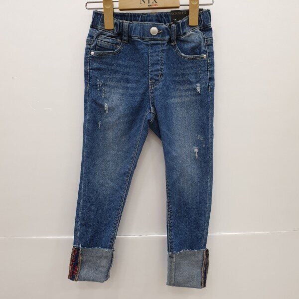 M톤과L톤의 중간컬러 턴업시 옆선 레드컬러의 레터링이 포인트인 롤업 스키니 데님팬츠입니다