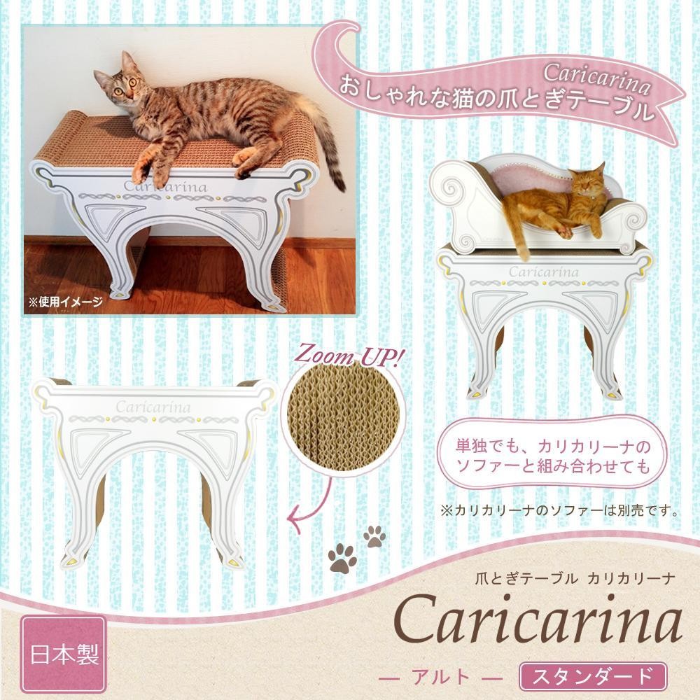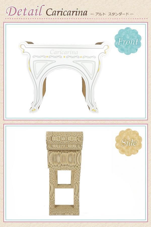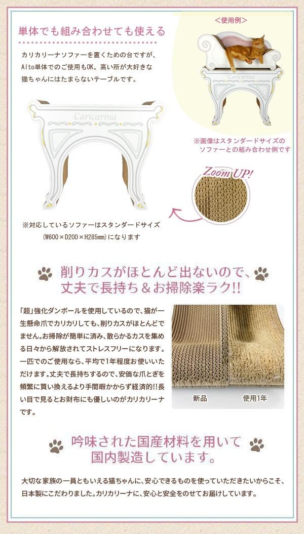 | カリカリーナソファーを置くための台ですが、Alto単体でのご使用もOK。高いところが大好きな猫ちゃんにはたまらないテーブルです。もちろん使用している素材は、カリカリーナシリーズでもお馴染みの「超」強化ダンボール。とっても硬いので削れにくく、カスがほとんど出ません。上部も側面も、内側でも、全方向で爪がとげます。垂直の爪とぎがお好きな猫ちゃんにもおすすめです。 |